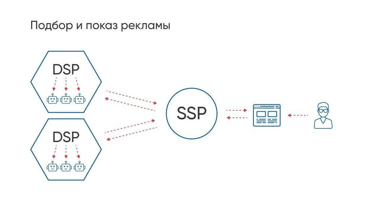 Условная коммуникация между DSP и SSP идет в формате аукциона, где SSP, по сути, и есть биржа, а DSP участвует в торгах за покупку рекламного места. Когда пользователь входит на сайт, отправляется запрос в SSP о наличии рекламы. SSP, в свою очередь, передает этот запрос нескольким DSP. Каждая система анализирует данные о пользователе и предлагает свою цену за показ рекламы.