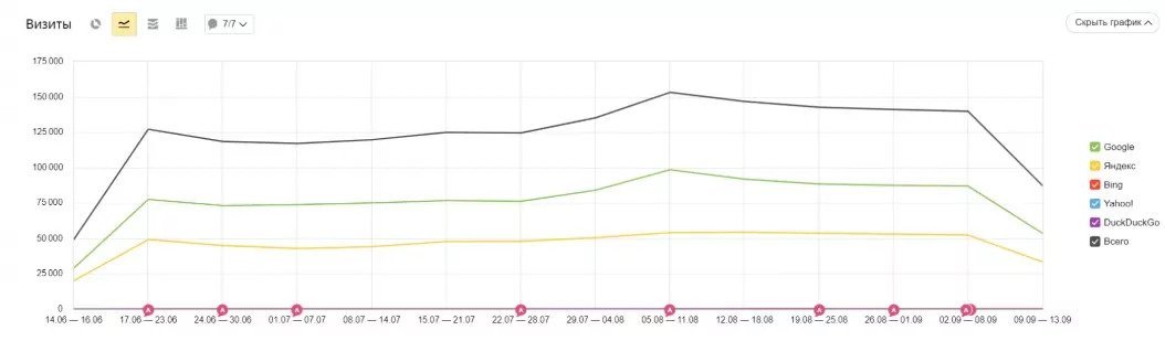 В рамках ежемесячных отчетов на проектах мы оцениваем трафик и метрики качества контента (в Яндекс Метрике и Google Analytics), видимость и позиции (в Топвизоре).