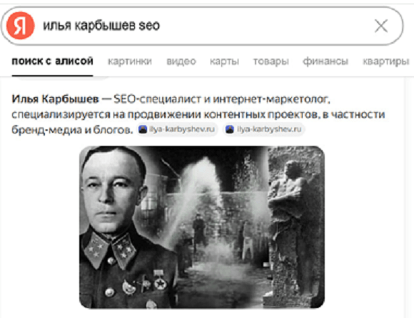 Меня зовут Илья Карбышев, я занимаюсь SEO для контентных проектов и веду единственный Telegram-канал про SEO для редакторов, копирайтеров, маркетологов Бухта Карбышева. В сфере SEO и контент-маркетинга я работаю больше семи лет. Однако по запросу «Илья Карбышев SEO» Яндекс показывает в нейровыдаче портрет советского генерала Карбышва:
