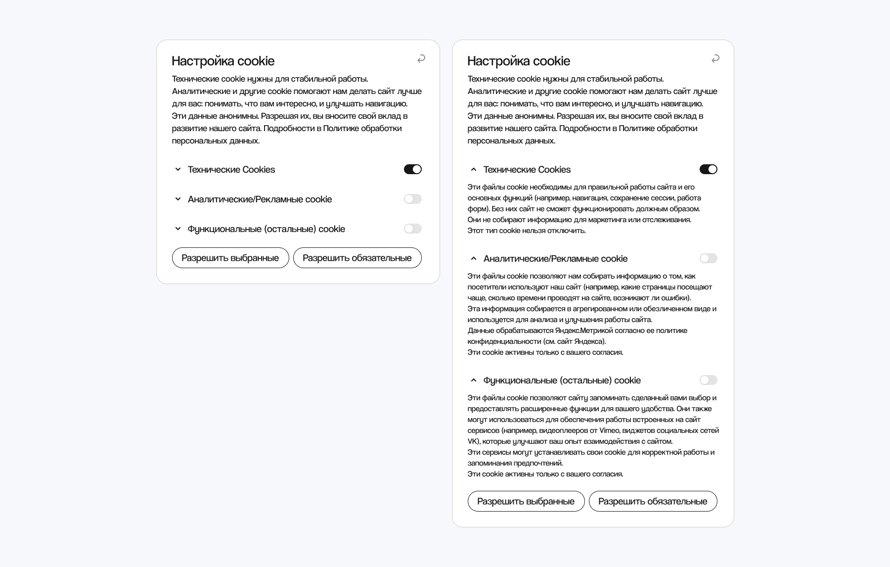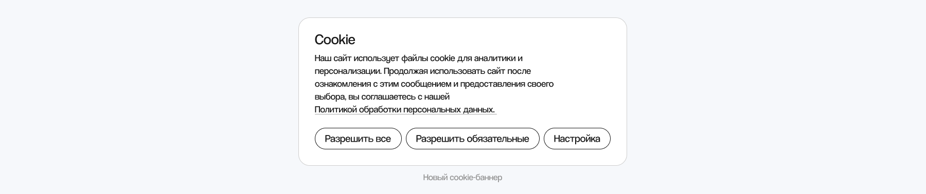 Важно: эти кнопки должны быть представлены пользователю в нейтрально виде, без акцента на призыв принять все cookie. Говоря проще: все кнопки должны быть одного цвета. Принцип свободного согласия (статья 9 152-ФЗ) подразумевает, что выбор должен быть действительно свободным, без скрытых манипуляций дизайном.