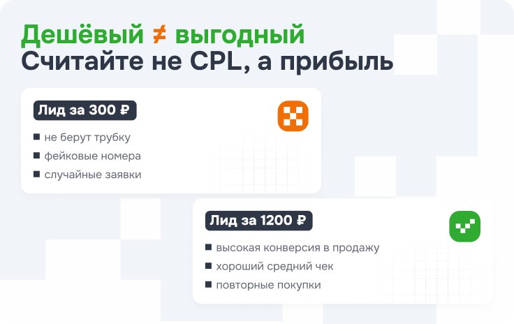 Это один из полезных и при этом редко используемых подходов. Здесь вы смотрите не только на цену лида, а на то, как этот лид ведет себя дальше. Можно получить лиды по 400 рублей и потом понять, что из них почти никто не покупает. А можно получать лиды по 1200 рублей, но с высокой конверсией в продажу и хорошим средним чеком.