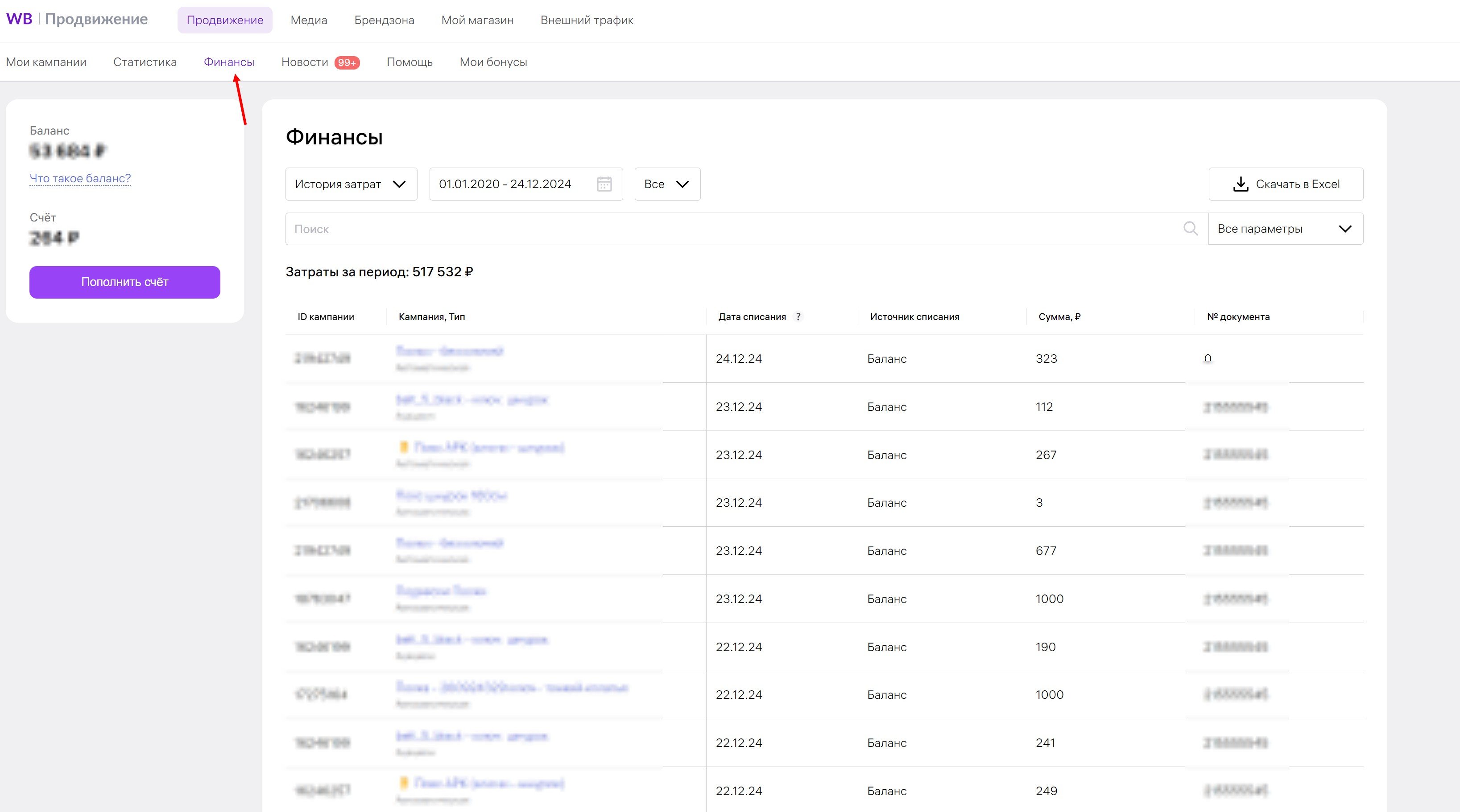 Где найти: в личном кабинете выберите раздел «Реклама» → «Финансы», где отображаются затраты на рекламные кампании в столбце «Сумма».
