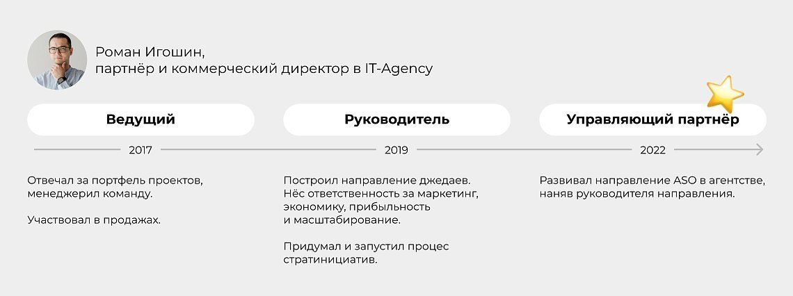 Например, на уровне руководителя человек ищет проекты и клиентов для своего направления. А на уровне ассошиэйт-партнёра разбирается, как привести целевых клиентов всему агентству, привлекает их и предлагает изменения, которые повлияют на всё агентство.