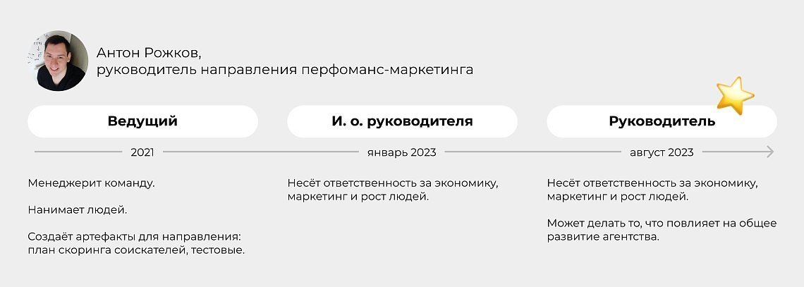 На скриншоте показано, как может выглядеть рост сотрудника. Следующая логичная ступень после ведущего — и.о. руководителя