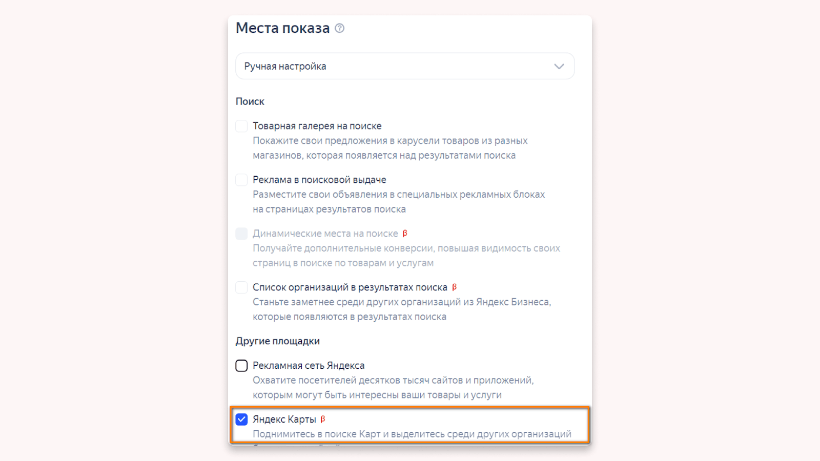 Войдите в уже существующий или создайте новый аккаунт в Яндекс Директ. Выберите “Создать новую кампанию”. В блоке “Места показа” выберите “Ручная настройка” и оставьте только “Яндекс Карты”.