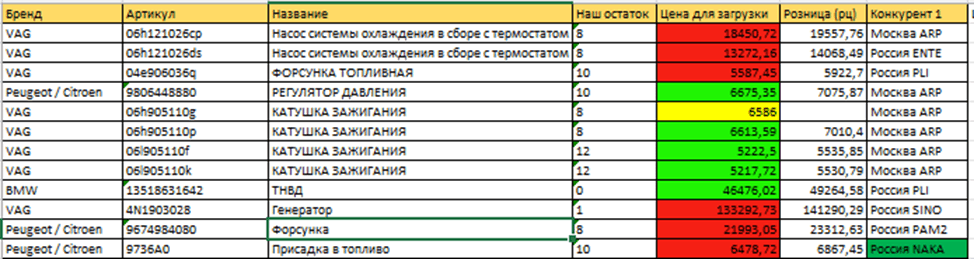 Если разница между ценой прошлой загрузки и текущей ценой для загрузки является положительной – то для «Цена для загрузки» используем зеленый цвет. Если же отрицательная – то красный.