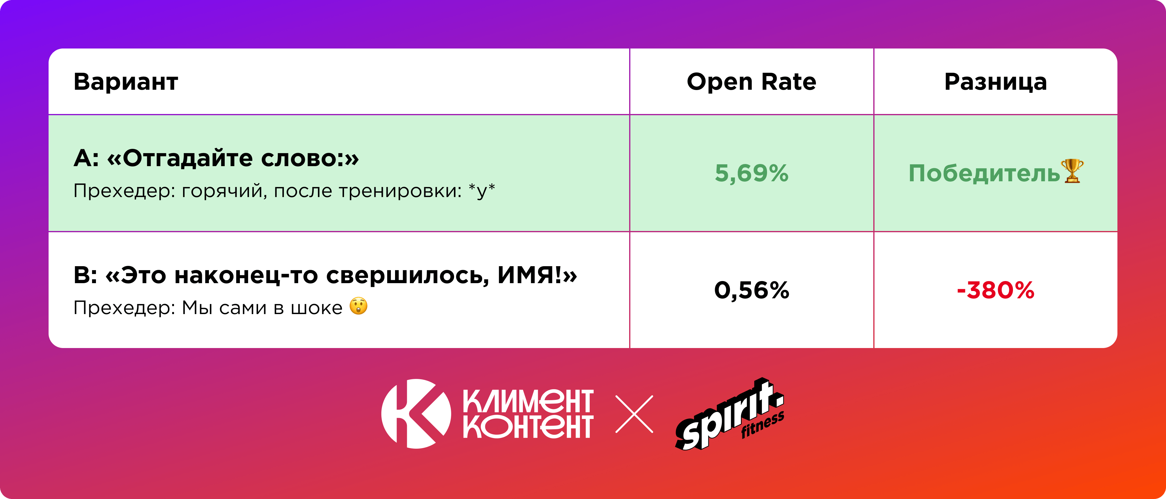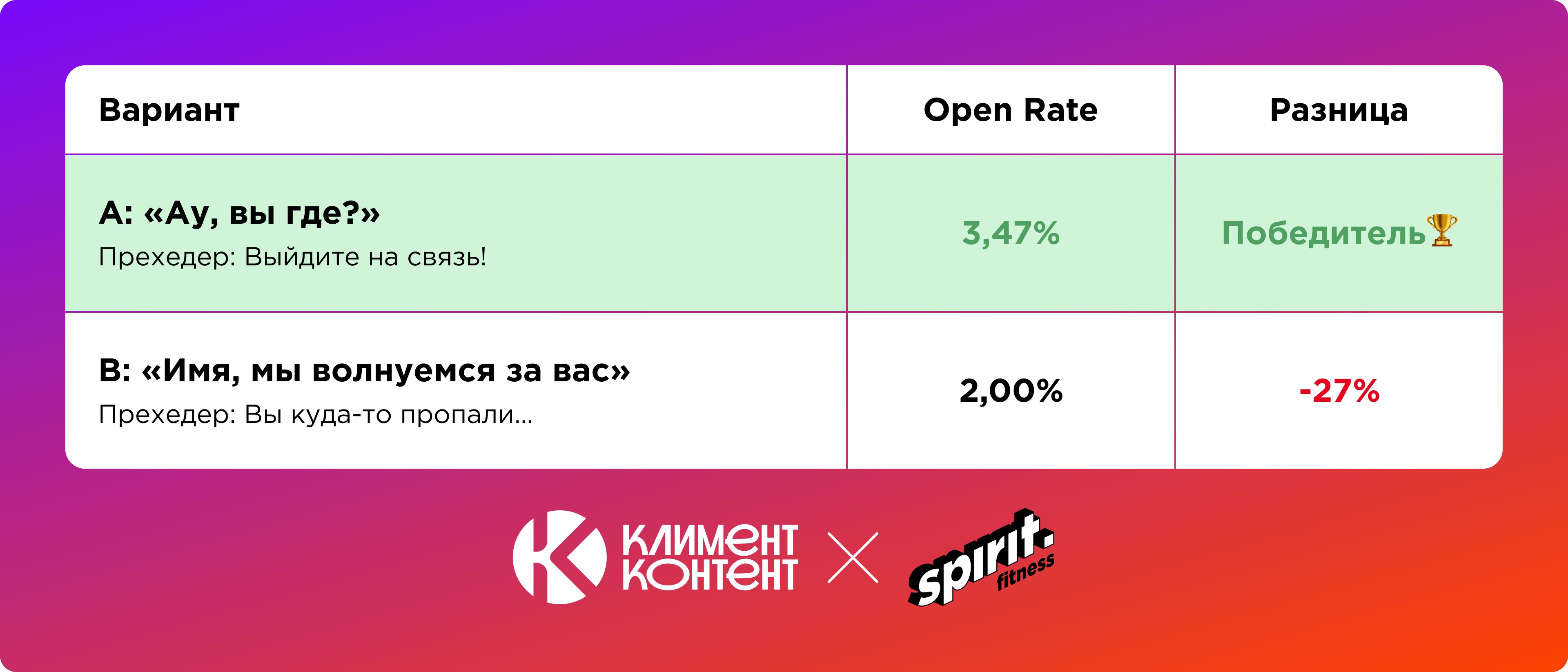 У нас был кейс по реактивации подписчиков в email-рассылке фитнес клуба Spirit. Fitness цель была сформулирована так: возвращение подписчиков к открытию писем и взаимодействию с брендом.
