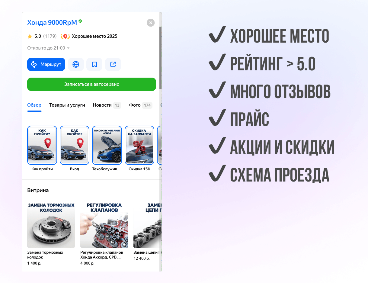 Если хотите подробнее разобраться, как повысить рейтинг автосервиса и усилить карточку в Яндекс Картах, я отдельно разобрал это в статье «Рабочие способы и фишки для роста рейтинга автосервиса на Яндекс.Картах».