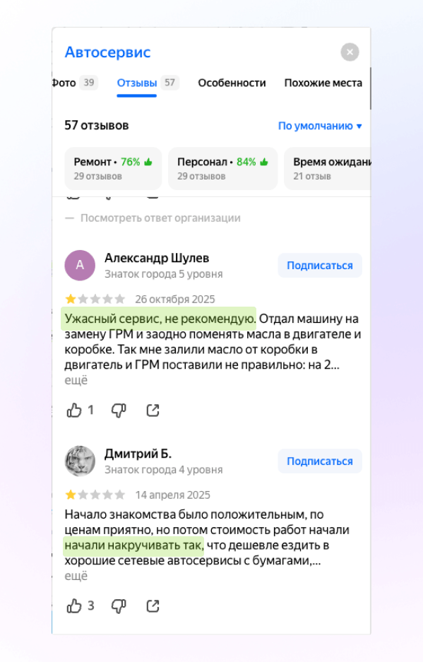 Даже если знакомый советует конкретный сервис, человек всё равно открывает Яндекс Карты. Он смотрит, где удобнее, что ближе, есть ли запись, какие отзывы и какой средний рейтинг. И если при открытии карточки он видит негатив в первых отзывах и низкий рейтинг, сомнения возникают автоматически.