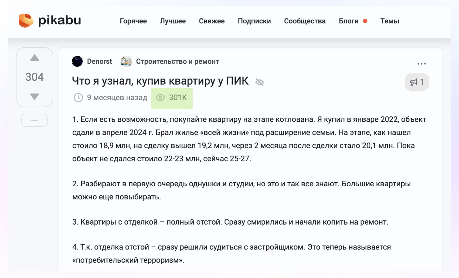 В недвижимости критически важно следить за тем, какой фон формируется вокруг компании и конкретного объекта. Причем речь идет не только об отзовиках и Яндекс Картах. Существенную роль играют форумы и обсуждения, которые формально могут не относиться к недвижимости напрямую. Это может быть например pikabu, woman.ru, дзен или любые другие площадки, где пользователи обсуждают застройщиков, районы и конкретные жилые комплексы.