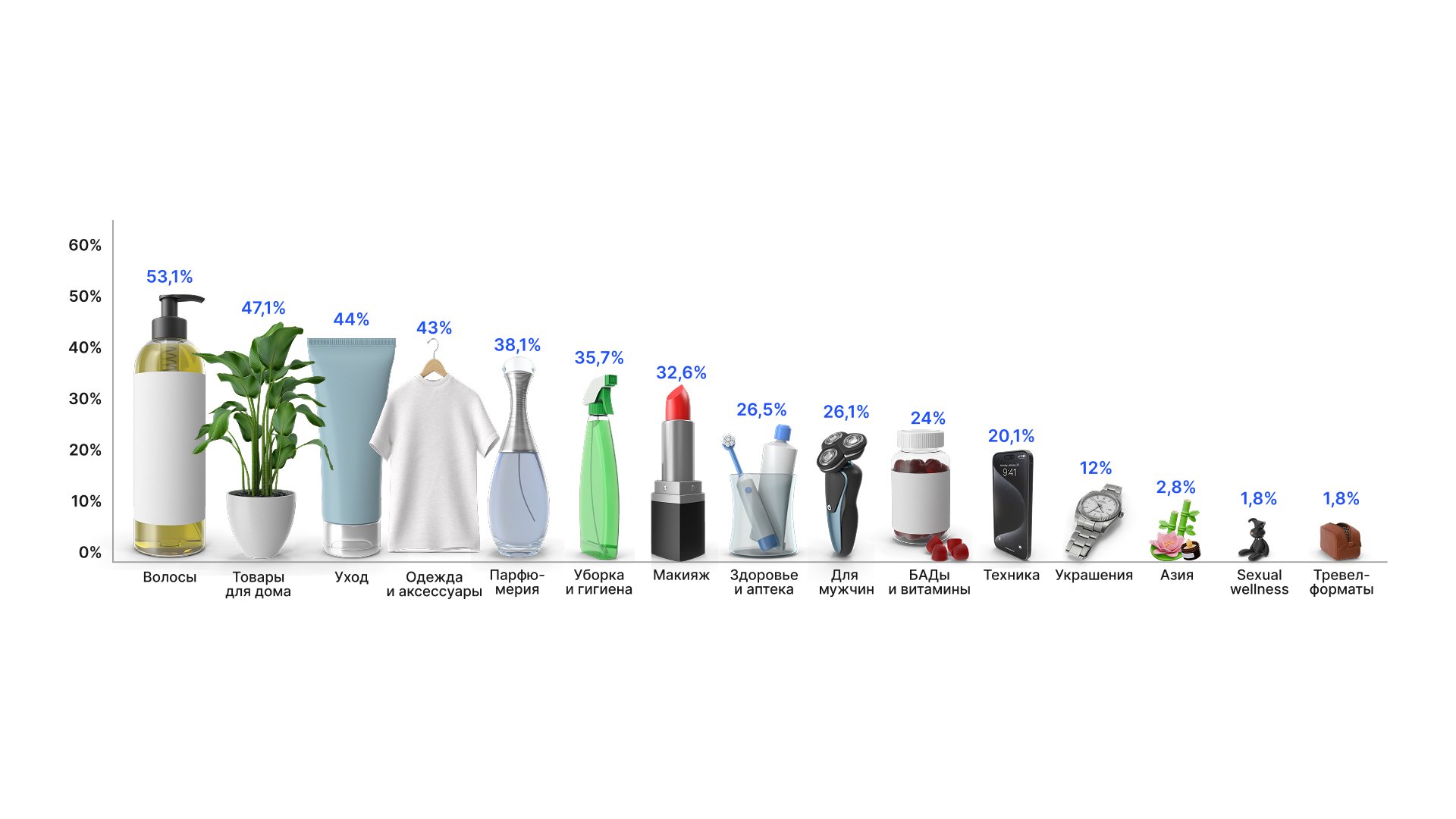 Наибольшей популярностью среди респондентов пользуются товары для ухода за волосами — их выбирают более 53% участников опроса. За ними следуют уходовая косметика (44%) и парфюмерия (38,1%). Высокие показатели у категорий одежды и аксессуаров (43%) и товаров для дома (47,1%) связаны с тем, что респонденты активно выбирали маркетплейсы, предлагающие широкий ассортимент.