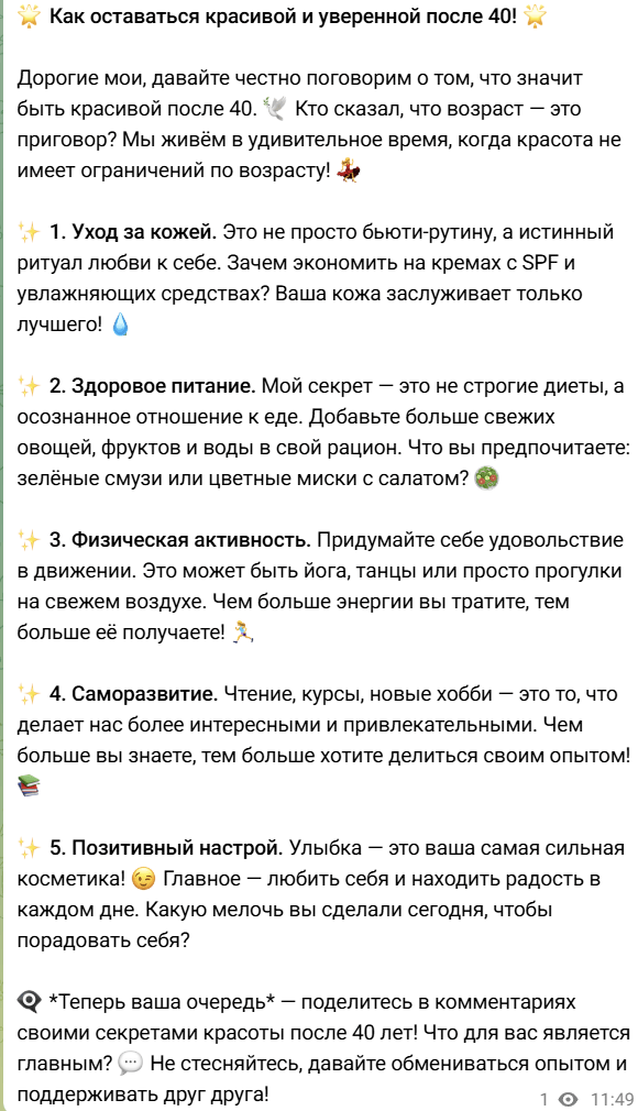 Или, допустим, вы хотите сделать пост на тему "Как оставаться красивой после 40 лет", но не знаете как начать. Надиктовали это боту голосом — и уже через минуту он выдаст вам структурированный текст с советами и интересной подачей.