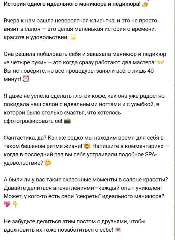 Пример:"К нам вчера пришла клиентка, заказала маникюр и педикюр в 4 руки — справились за 40 минут, клиентка в восторге!" Бот за секунды превращает это в готовый пост в формате истории, которую можно сразу публиковать в соцсети.