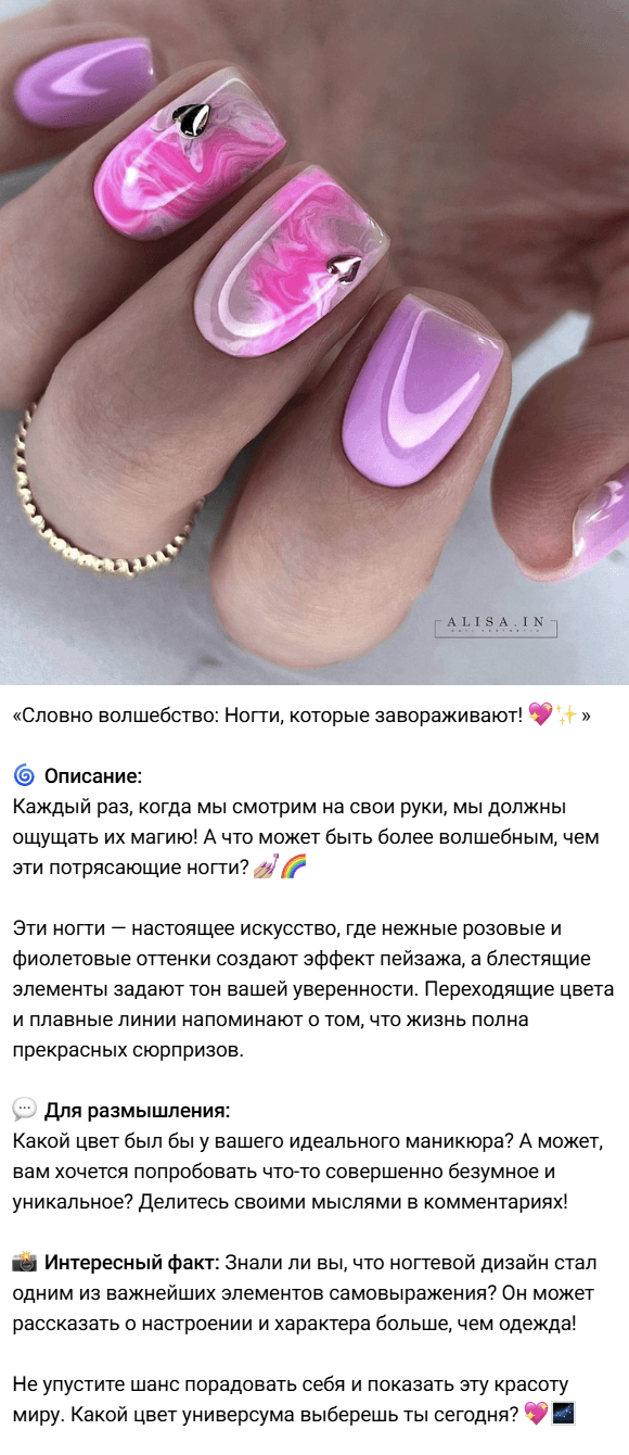 Вы сделали фото свежего маникюра и не знаете, как описать? Просто кидаете фото боту — и через пару секунд получаете пост: "Золотые акценты и игра контрастов — этот маникюр вдохновлён классикой и современностью. Подчеркнёт ваш стиль и настроение в любой день!"