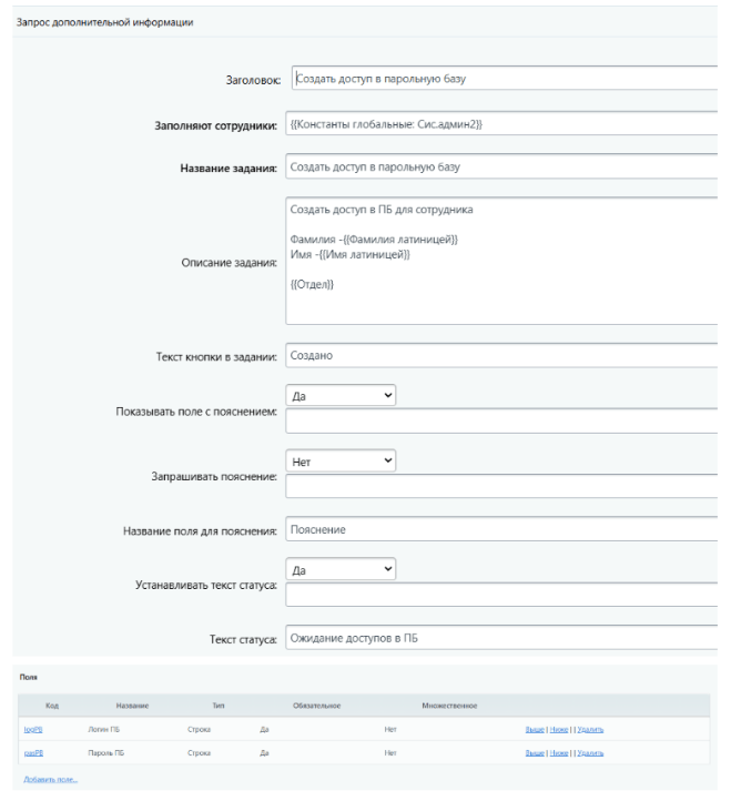 Как внедрить у себя: используйте действие “Запрос дополнительной информации”, где исполнитель не просто нажимает кнопку, а обязан вернуть в процесс логин и пароль.