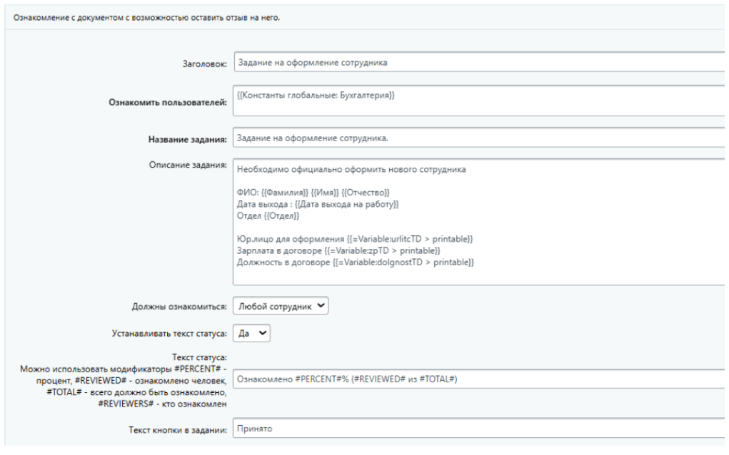 Как внедрить у себя: на старте добавьте действие уведомления в ленту или сообщение ответственному. В текст подставьте переменные из поля сотрудника, дату выхода и ссылку на процесс.