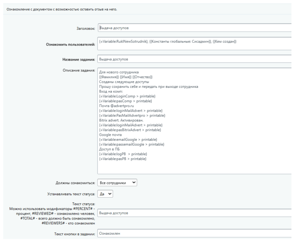 После того как все логины и пароли собраны, процесс формирует итоговое ознакомление “Выдача доступов”. В него подтягиваются данные по компьютеру, почте, Bitrix24 и парольной базе.