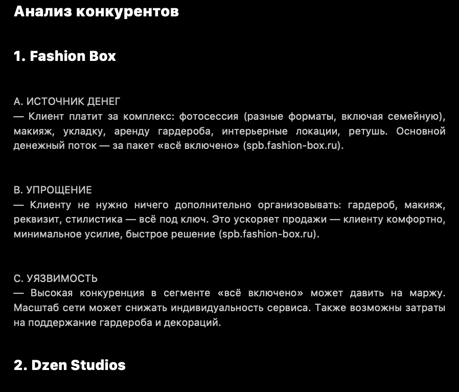 Рынок и конкуренты. ИИ сам нашёл сопоставимые студии, оценил их бизнес-модели, ценовую политику, сильные и слабые стороны. Интересно, что он не просто сравнивал «по фичам», а анализировал, откуда конкуренты зарабатывают деньги и как упрощают клиенту жизнь — ключ к высокой конверсии.