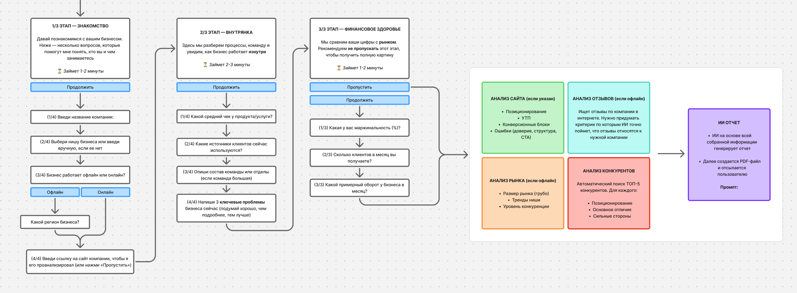 И вот наступает момент, когда все вводные, которые ты собрал, превращаются в конкретные выводы и рекомендации. ИИ берет всю информацию — от базовой анкеты до финансов и процессов — и приступает к созданию отчета. На этом этапе происходит несколько вещей одновременно: