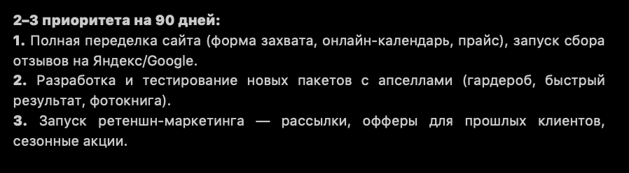 Итог: всего за 5 минут мы получили конкретный, структурированный список действий, который реально увеличивает доход и поток клиентов.