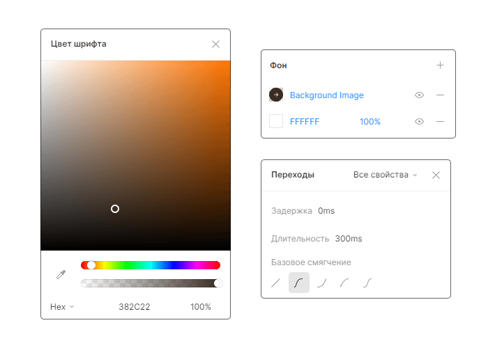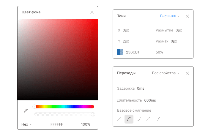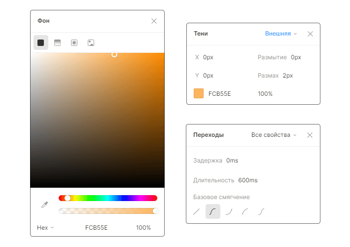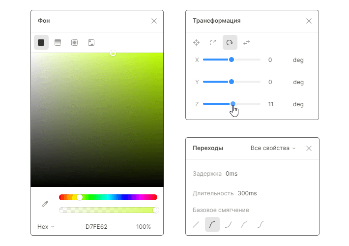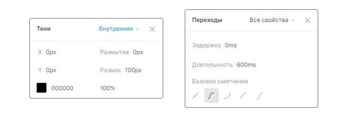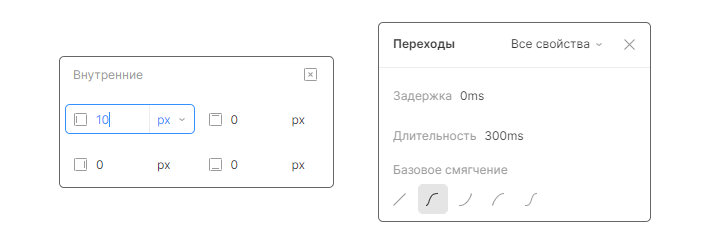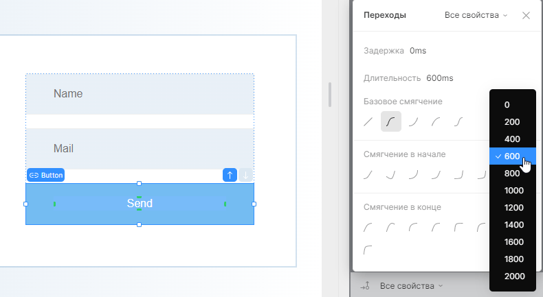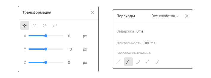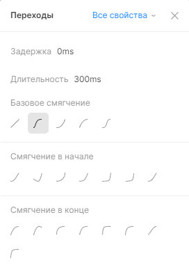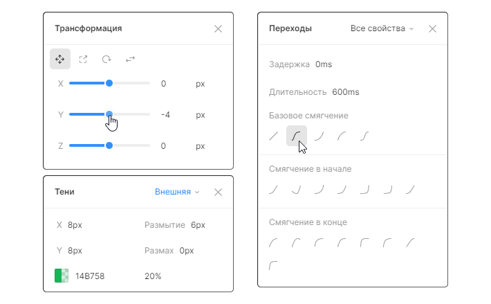 Для создания плавных интерактивных эффектов используются настройки перехода (Transition), у которых есть следующие параметры: