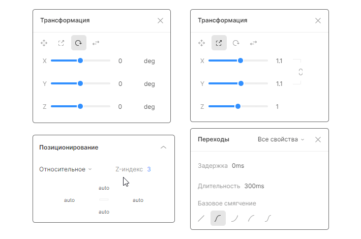 🔹 трансформировать элемент — масштабировать, сдвинуть по любой оси, повернуть или наклонить.