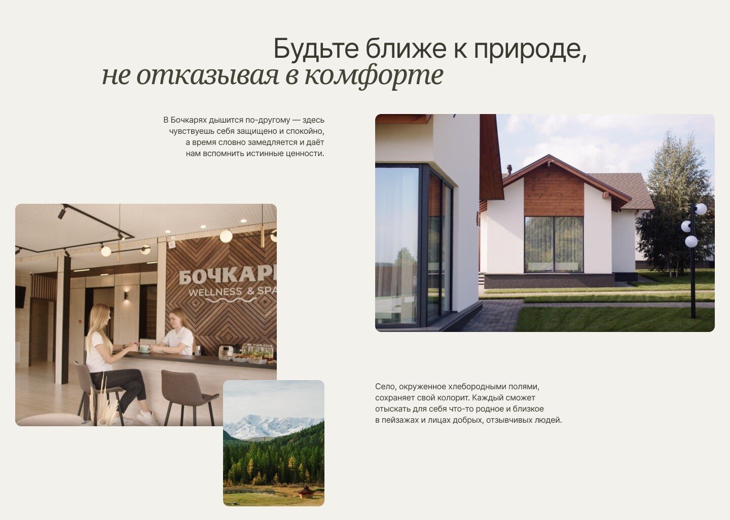 Давайте снова покажем на примере — нашем проекте для туркластера «Бочкари 1825». На этапе погружения в проект мы поняли, что у отеля не получится позиционироваться на сайте просто как спа-отель. Туркластер расположен в 300 километрах от ближайшего крупного города: хорошее спа и оздоровление можно найти и поближе, не уезжая в такую даль.