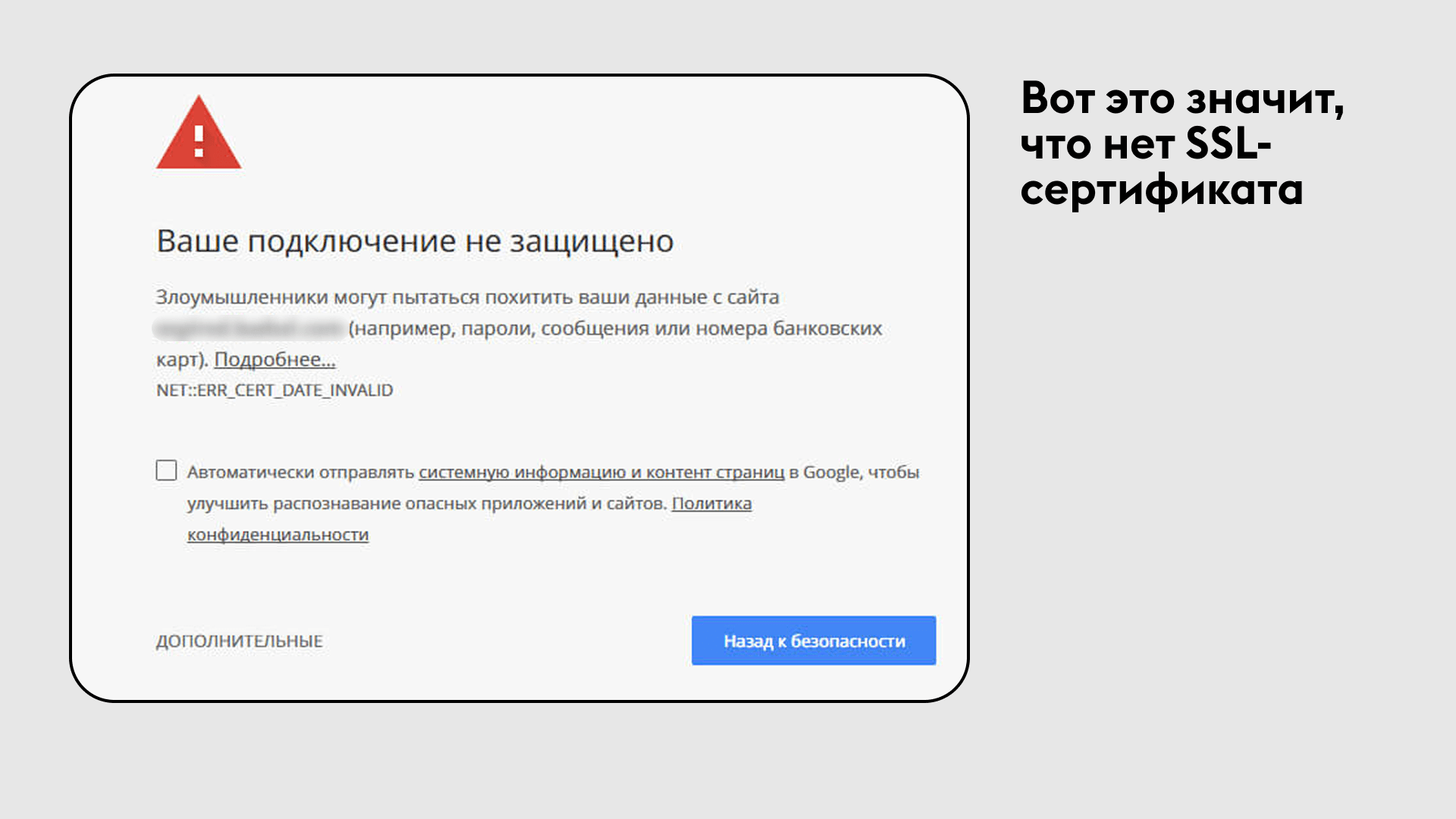 Безопасность — важный фактор для поисковиков. Если сайт работает по HTTP, а не HTTPS, поисковики воспринимают его как небезопасный. В Chrome вообще показывается предупреждение «Этот сайт небезопасен.