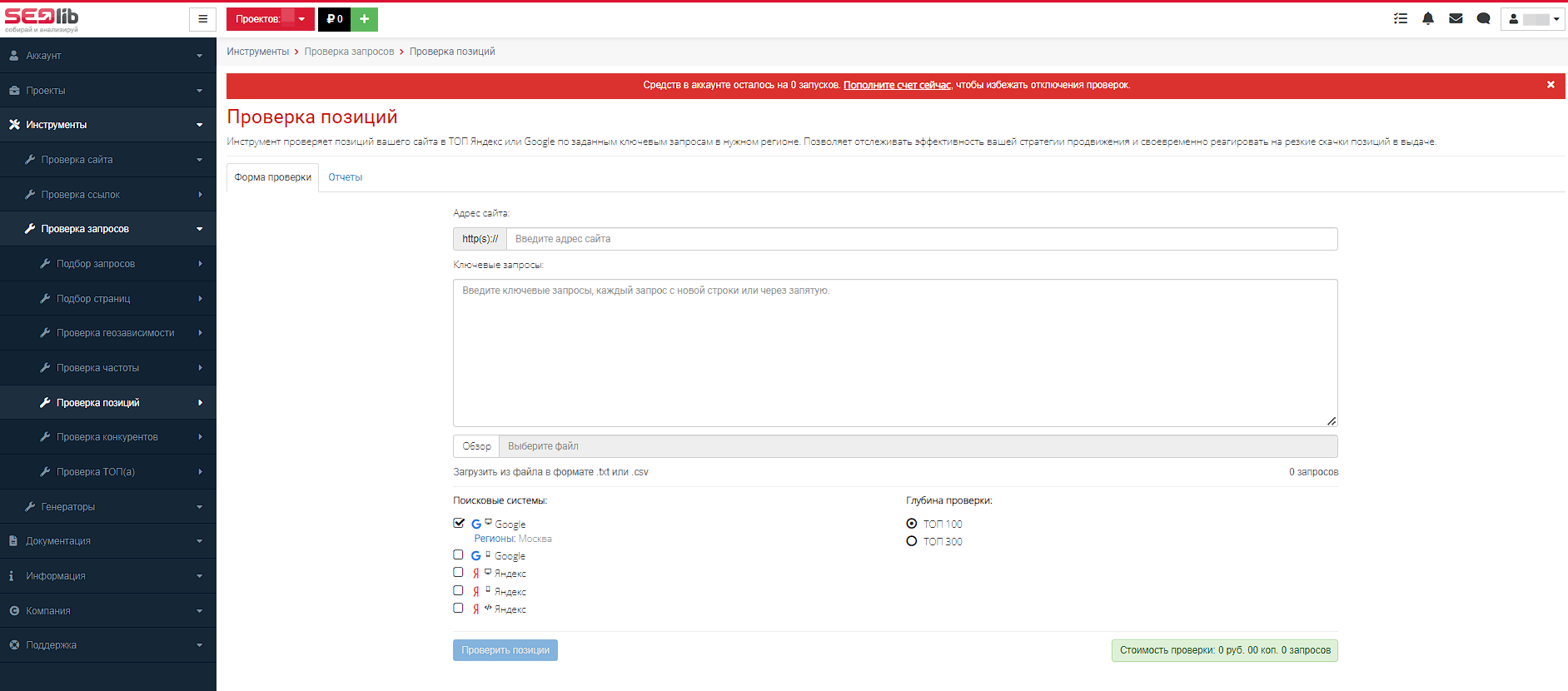 SEOlib предлагает своим пользователям широкий спектр функций, включая анализ сайта, проверку позиций, индексацию, трафик и многое другое. Имеет простой интерфейс и предлагает различные тарифные планы.