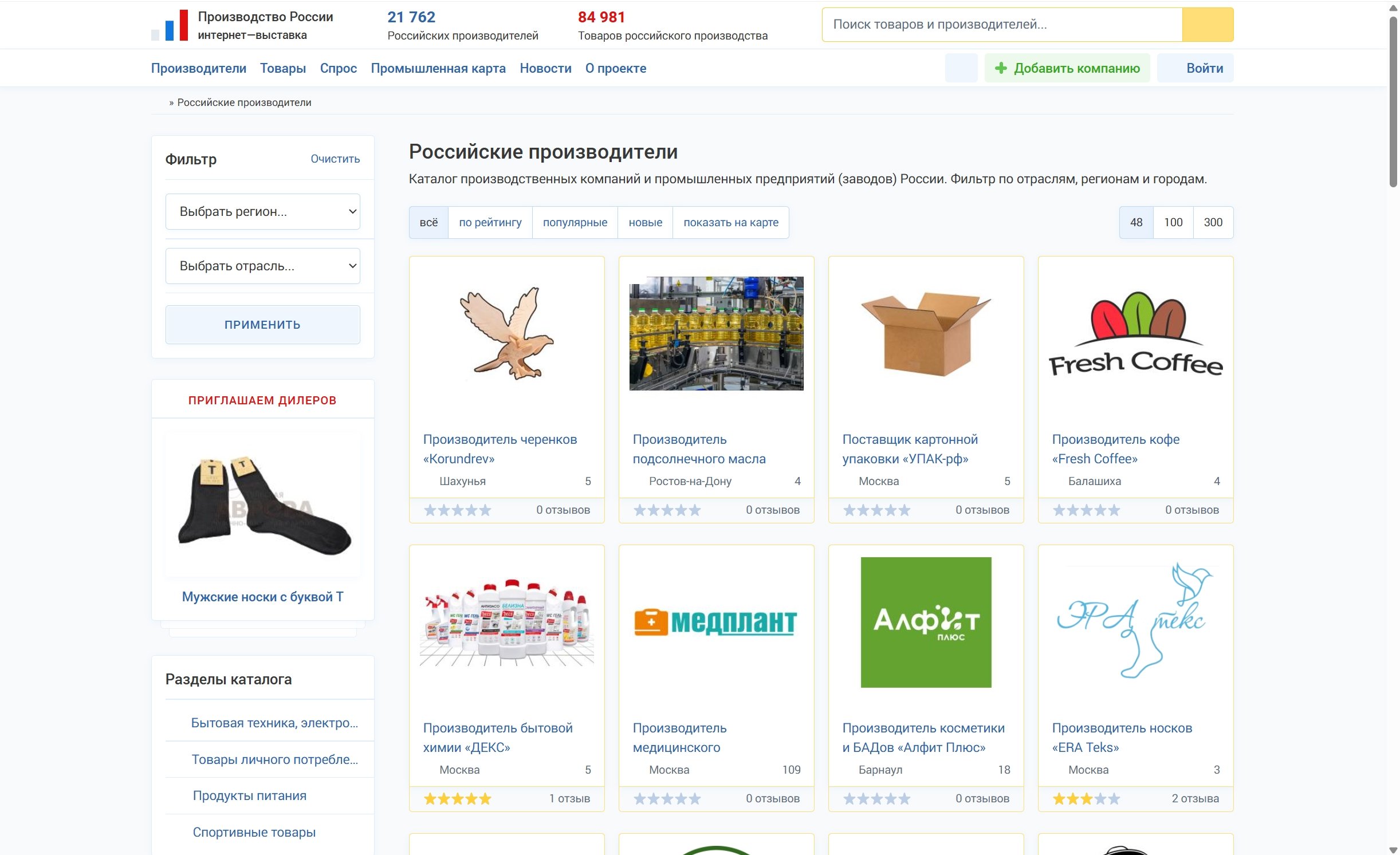 например, сайт о российских производствах, где по удобным фильтрам можно найти нужные компании и организации с учётом региона