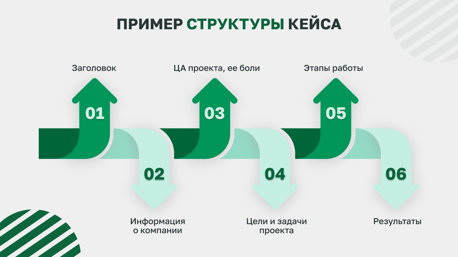 Сначала нужно прописать структуру будущего кейса. Самая простая и рабочая структура: