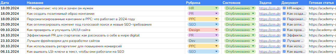 Контент-план рекомендуем создавать в таблицах, которые легко редактируются и имеют возможность работы нескольких пользователей одновременно. Например, Google Таблицы — достаточно предоставить доступ или ссылку, чтобы коллеги могли открыть, изучить план и внести поправки.