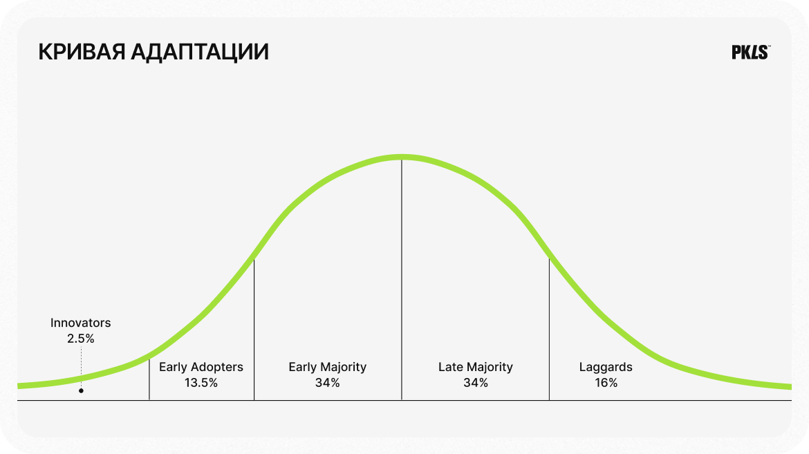 Перед тем как сегментировать аудиторию, мы посмотрели на сам рынок: насколько он зрелый, как много людей уже знакомы с форматом аренды авто, что мешает им использовать такой сервис. Здесь помогла модель Diffusion of Innovations — она делит аудиторию на пять категорий: