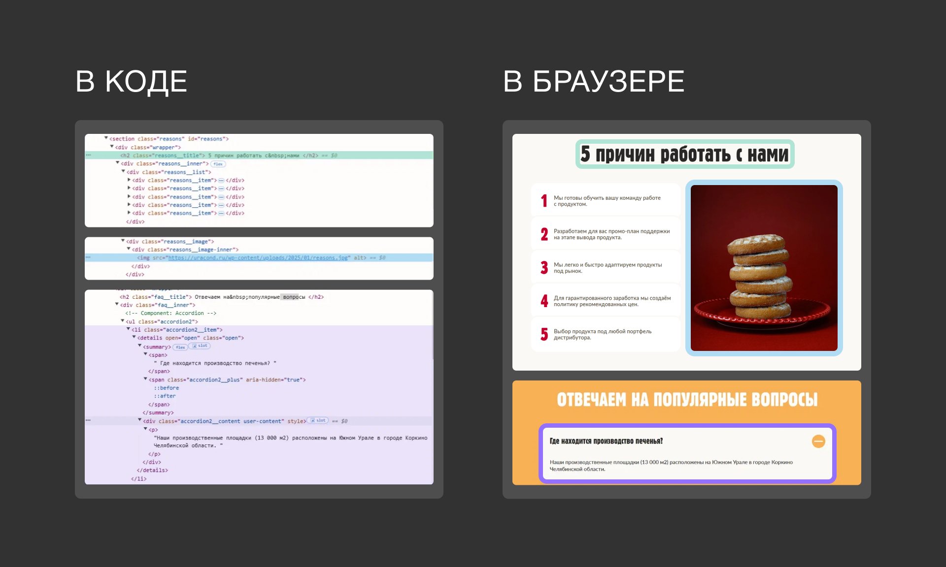 HTML – это язык, на котором описывается структура сайта. Он помогает браузеру и поисковым роботам «понять» назначение информации – где заголовок, основной текст, изображение и т.д. Внутри HTML-файл часто делится на две части: и . В части расположена техническая информация для браузера: заголовок страницы, по каким запросам ее можно выводить в поисковой выдаче и т.д. В части описано все содержимое, которое пользователь видит в виде различных элементов страницы, а также подключаются скрипты и стили.