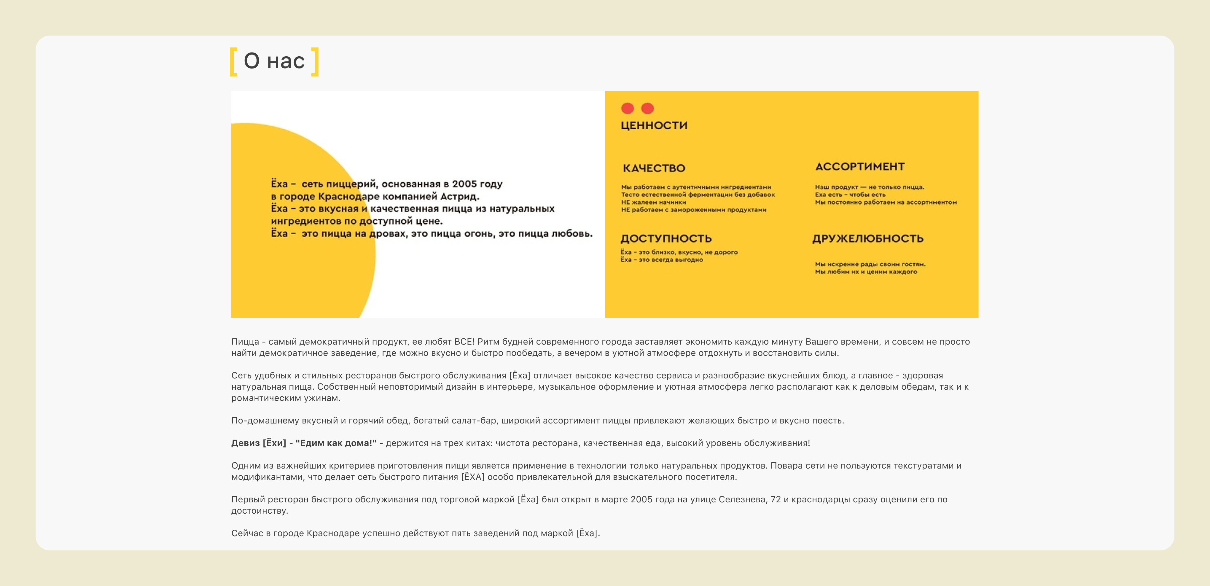 Пример: В разделе «О нас» пиццерия может рассказать историю компании, указать адреса ресторанов и добавить фотографии команды.