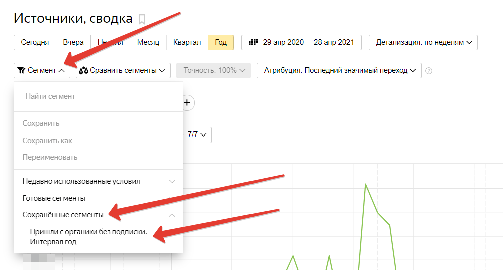 Для этого можно зайти в любой отчёт и выбрать сохранённый сегмент.