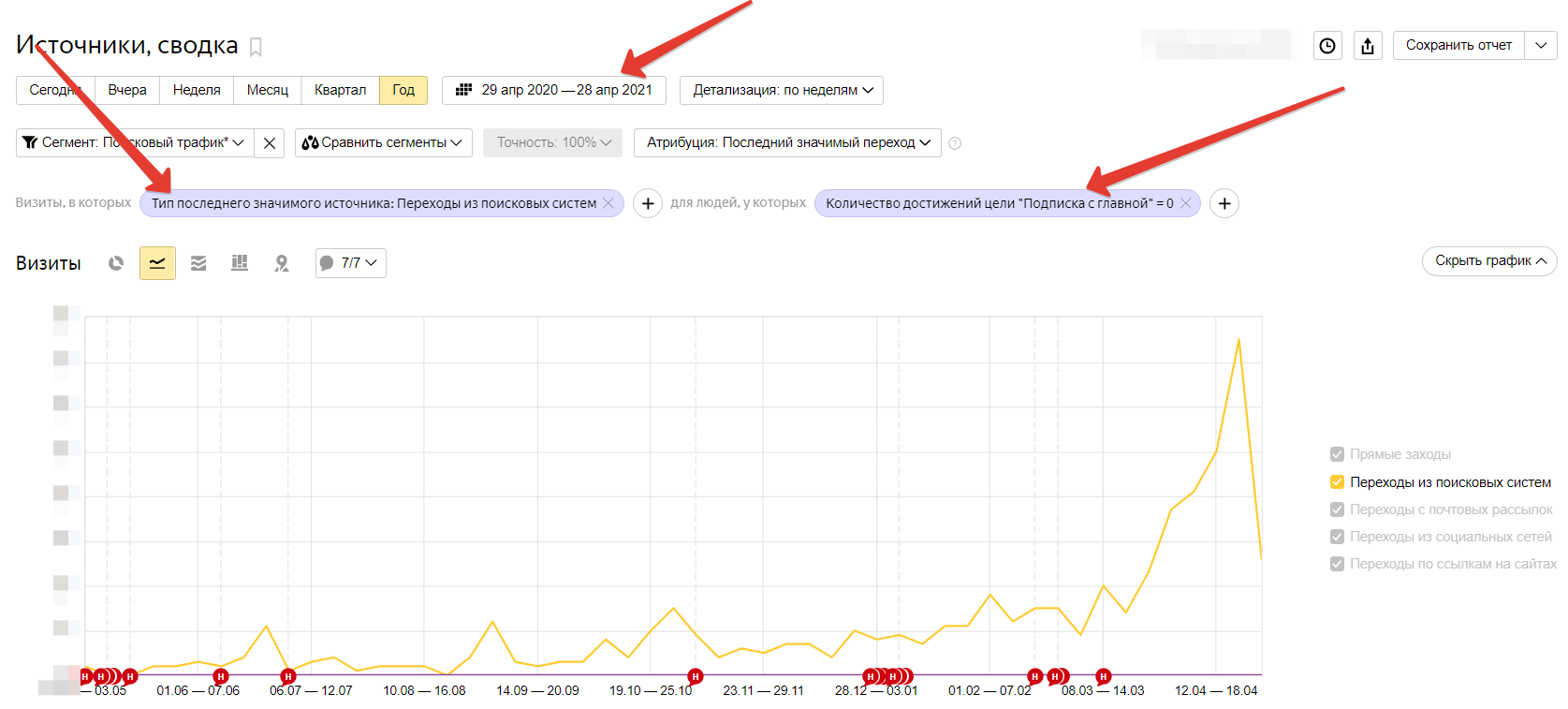 Для этого выбираем нужный интервал, период — год, источник трафика — поисковый, количество достижений выбранной цели — 0.