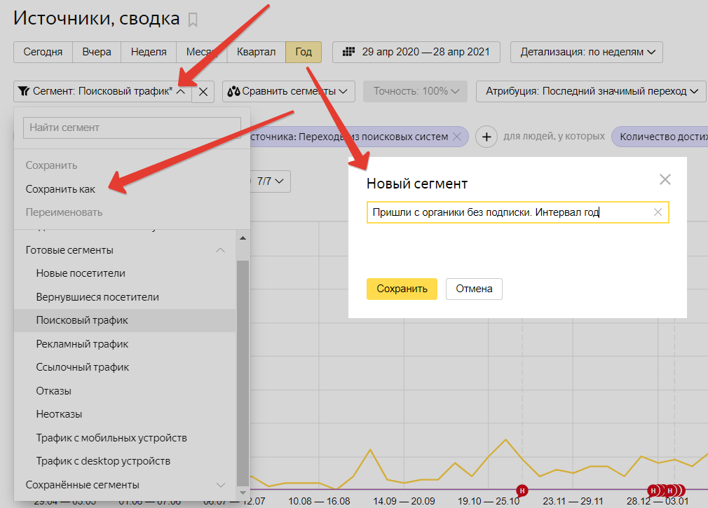 Находясь в любом отчёте Метрики, вы можете создать сегмент, например, из-под отчёта «Источники, сводка». Для сегмента обозначим цель: хотим объединить в сегмент всех, кто пришёл из поиска и не подписался на рассылку на сайте.