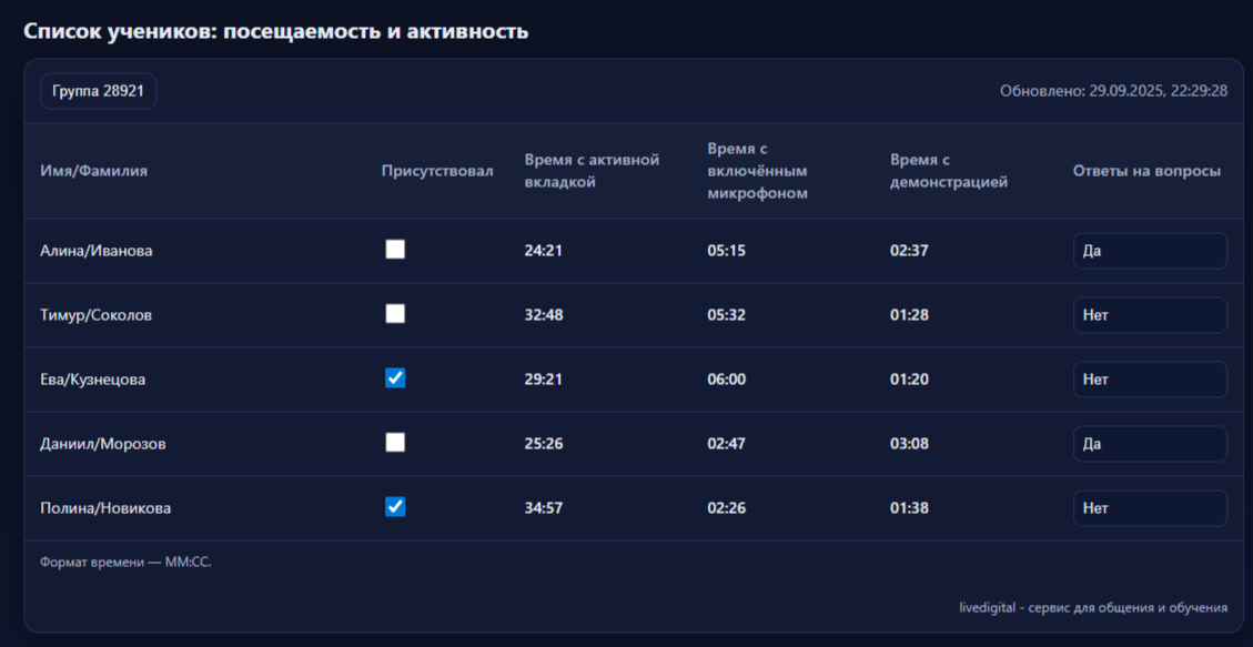 У нас это собирается автоматически — преподаватель видит, кто реально вовлечён, а кто «присутствует формально». Эти данные помогают вовремя поддержать пассивных ребят и не потерять их мотивацию.