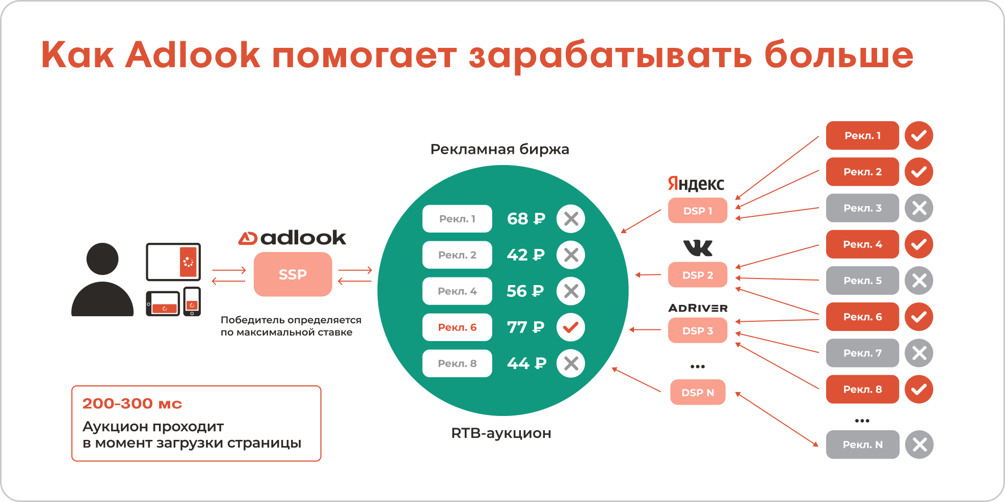Если ставка выигрывает, пользователь видит наиболее релевантное для него объявление. Весь процесс занимает миллисекунды, что позволяет рекламодателям эффективно достичь своей аудитории, а издателям — оптимизировать доход.