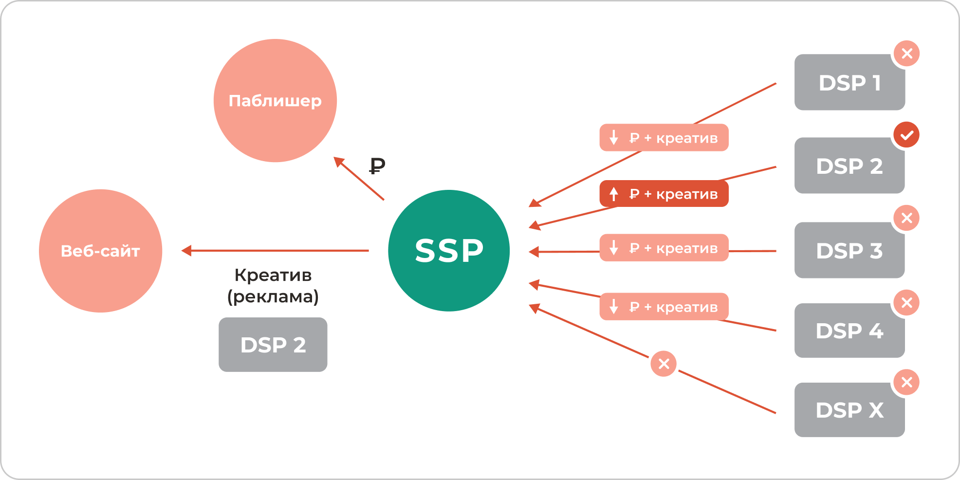 Когда пользователь заходит на веб-страницу или в мобильное приложение, SSP отправляет информацию о доступном рекламном месте на Ad Exchange. DSP анализируют эту информацию и делают ставки на показ рекламы. SSP выбирает наивысшую ставку и отображает соответствующее объявление пользователю. Весь этот процесс занимает доли секунды и происходит автоматически.