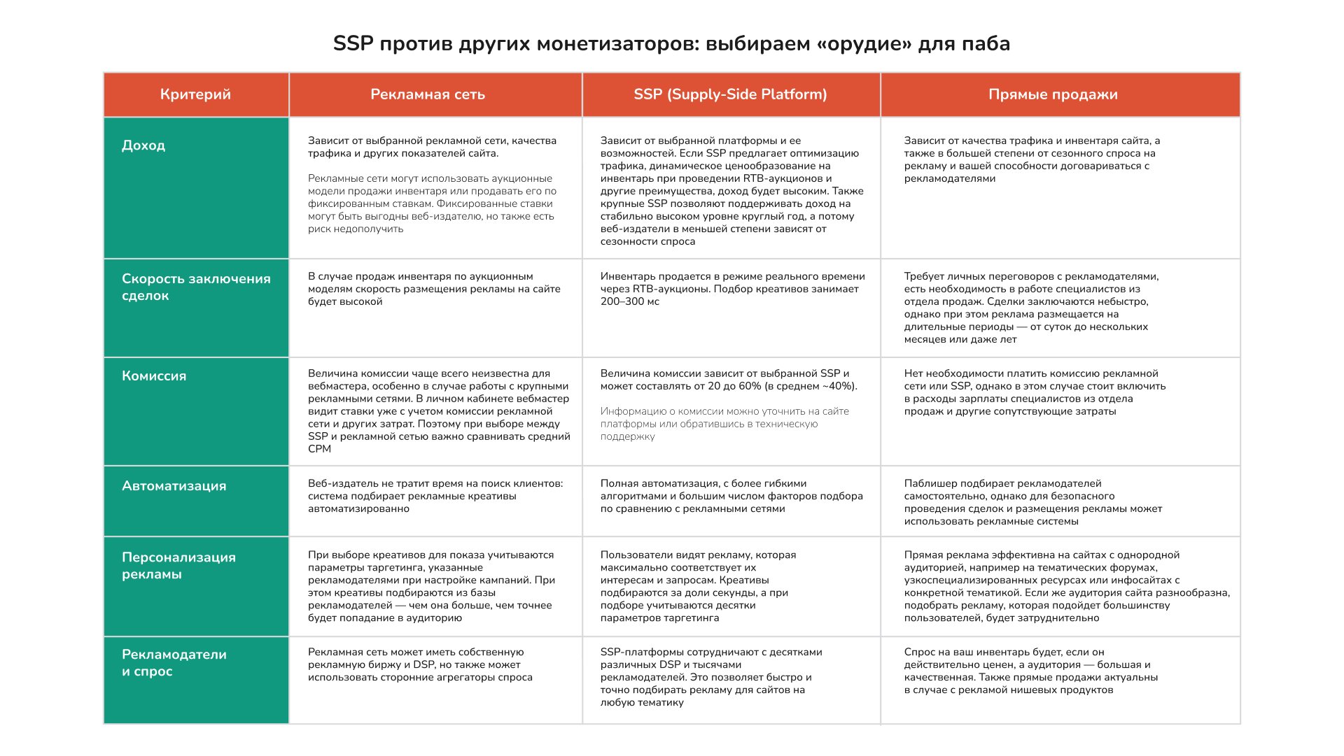 Рекламная сеть или SSP? А может, стоит продавать инвентарь «по старинке» — договариваться с рекламодателями напрямую? Неважно, насколько большой у вас проект — сайт для локальной аудитории или многомиллионный ресурс — вы всегда сможете на нем хорошо зарабатывать. Выбор правильного инструмента монетизации зависит от стратегии паблишера, объема трафика и возможностей для размещения рекламы. Чтобы помочь вам определиться, мы подготовили подробную сравнительную таблицу с шестью критериями: