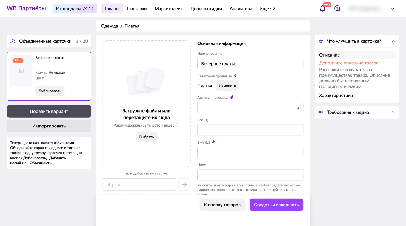 Заполнять ли необязательные поля — вы решаете сами. Но советуем все же сделать это: чем больше информации о товаре, тем выше он в выдаче.