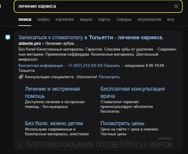 Контекстная реклама остаётся одним из самых эффективных инструментов для привлечения новых клиентов. Платформы, такие как Яндекс.Директ и Google Ads, позволяют нацелиться на пользователей, которые уже ищут стоматологические услуги. Например, запрос «лечение кариеса в центре города» может привести потенциального клиента прямо к вашей клинике.