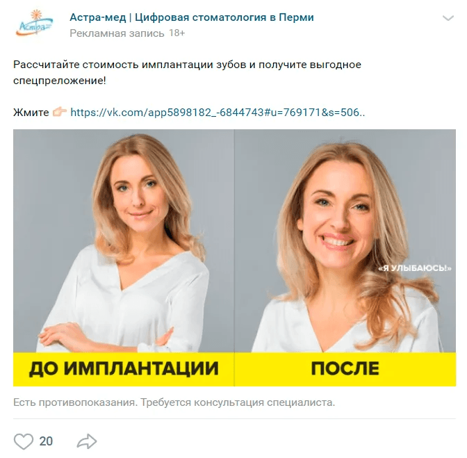 Социальные сети стали мощным инструментом для взаимодействия с клиентами. С помощью таргетированной рекламы клиники могут показать свои услуги людям, интересующимся здоровьем, медициной и уходом за собой. Например, рекламные акции для семейных клиентов или специальных предложений на чистку зубов могут стать эффективным мотиватором.