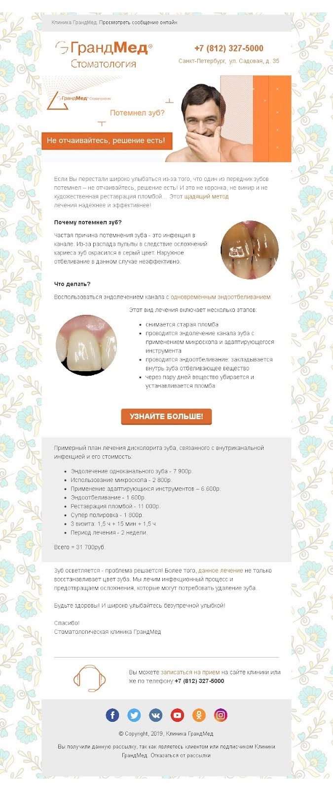 Персонализированные рассылки и чат-боты помогают напоминать о запланированных приёмах, сообщать об акциях и удерживать постоянных пациентов. Также через мессенджеры удобно делиться полезными рекомендациями, например, советами по уходу за зубами, что повышает лояльность клиентов. Рассылки можно сегментировать, чтобы предлагать услуги, наиболее подходящие для разных групп пациентов, будь то профилактика для семей или профессиональная чистка для офисных работников.
