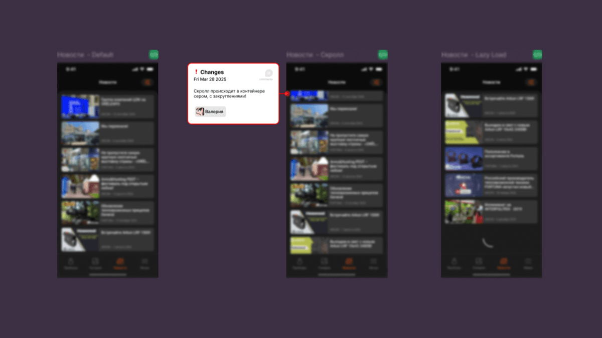 Важной частью процесса передачи макетов является детализация. Мы стараемся включать в макеты всю необходимую информацию, чтобы разработчикам не приходилось гадать или додумывать, как именно должны работать элементы и экраны в разных ситуациях.