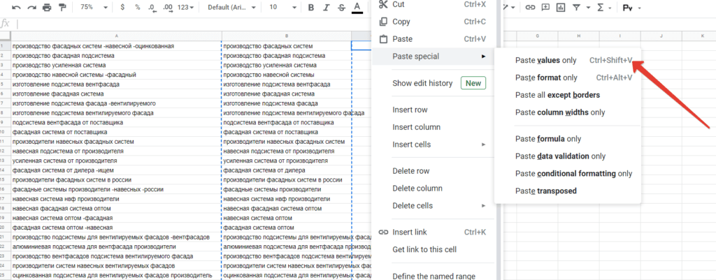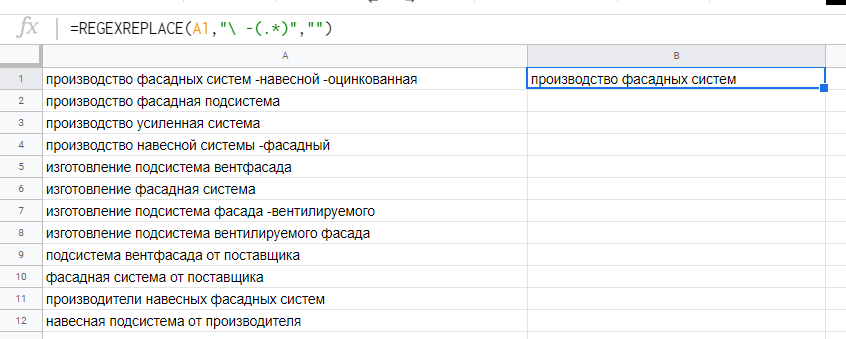 Чтобы выполнить задачу и удалить минус-слова на ключах, копируем список фраз и вставляем в Гугл таблицы. В соседнюю ячейке пишем формулу: