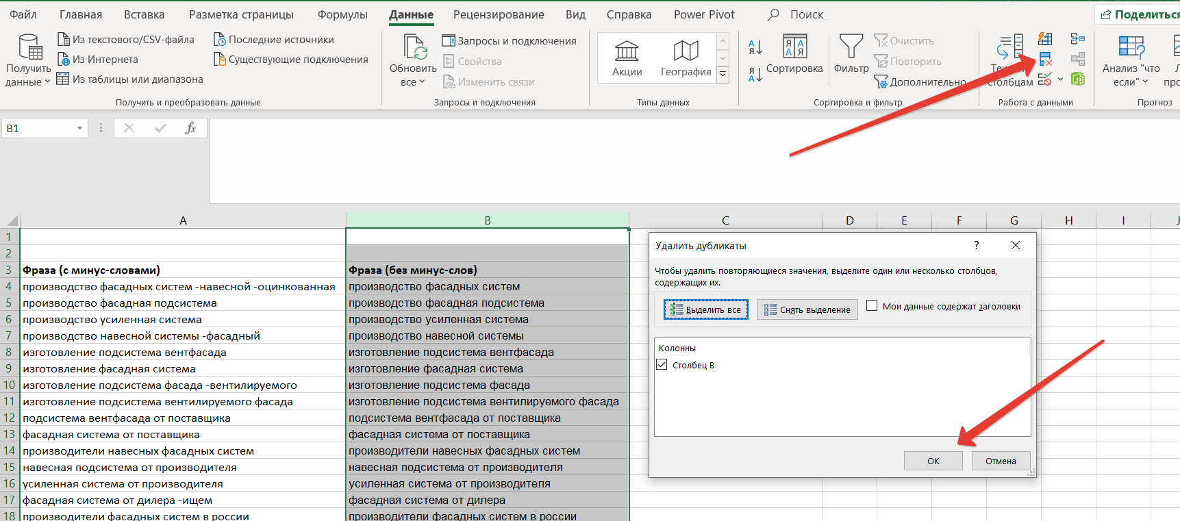 Маркетолог может столкнуться с необходимостью удаления минус-слов на ключах в Excel, когда нужно сделать отчет для клиента, быстрый анализ, внести правки и т.д.