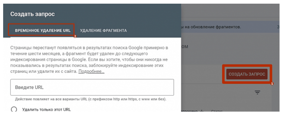 Чтобы передать страницу на удаление, нажмите на красную кнопку «Создать запрос» → в появившемся окне выберите "Временное удаление URL".